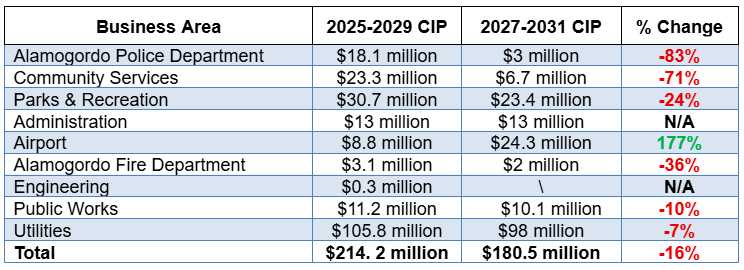 The City of Alamogordo’s updated 2027–2031 Capital Improvement Plan takes a more conservative investment stance than the prior 2025–2029 plan. Total planned capital spending decreases by about 16% (roughly 33.7 million dollars), and the project count drops from 75 to 68, concentrating funding into fewer, higher value efforts. Utilities remains the largest share of capital investment in both plans, but the new CIP reallocates dollars away from Community Services and Public Safety, especially larger Police facility work, while significantly increasing Airport related investments. For vendors, this points to a market that is de emphasizing marquee civic and public safety facilities and leaning into essential infrastructure and aviation linked economic development.