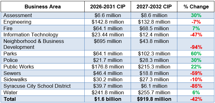 Between the City of Syracuse’s 2026–2031 and 2027–2032 Capital Improvement Programs (CIP), total planned investment declines from $1.6 billion to $919.8 million, a (-42%) reduction. The plan also contracts slightly in scope, from 165 projects to 160, indicating fewer total line items but still a broad program. The largest driver of this shift is Neighborhood & Business Development, which drops from $695 million to $43.8 million dollars (−94%), largely reflecting the presence of a single megaproject in the earlier plan. At the same time, Parks (+60%), Assessment (+30%), Police (+30%), Water (+6%), and Fire (+7%) increase, while Engineering, IT, Sewers, Sidewalks, and the Syracuse City School District see reductions. In effect, the new plan normalizes after a onetime spike, with less emphasis on large, Redevelopment driven investments and greater focus on core infrastructure, public safety, and parks. For vendors, this means fewer “all-or-nothing” megaprojects and steadier workstreams in streets, water, and public facilities.