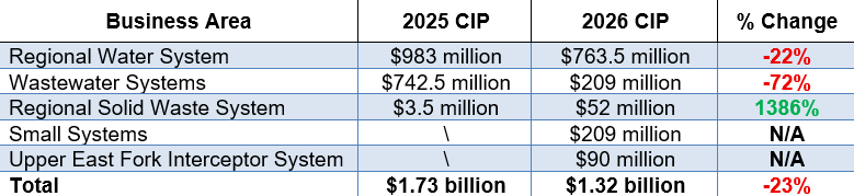 In 2025, NTMWD programmed $1.73 billion in total capital value, supported by a relatively broad project slate. By contrast, the 2026 CIP reflects a reduction of roughly $404.5 million (about 23%), paired with a decrease of nine projects. This contraction suggests that several large projects either reached completion, were deferred, or were consolidated, resulting in a leaner but more targeted capital plan for 2026.